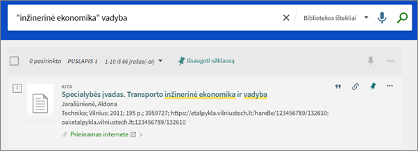 - Tikslios frazės ir atskirų žodžių paieškos gali būti kombinuojamos. Pavyzdžiui: „inžinerinė ekonomika“ vadyba atliks kombinuotą paiešką: