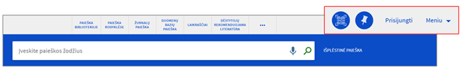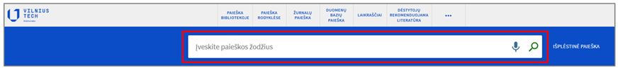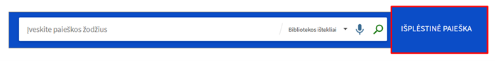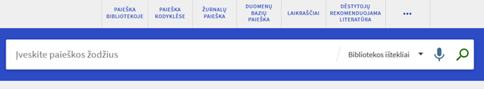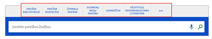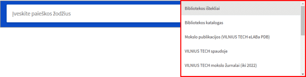 - Pageidaujamą paieškos išteklių galima pasirinkti iš sąrašo paieškos juostoje aktyvuojamame meniu: