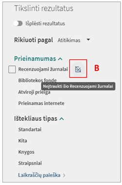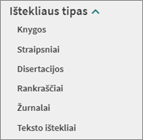 - Pasirinkus filtrą „Ištekliaus tipas“, galėsite filtruoti paieškos rezultatus pagal dokumentų tipą (knygos, straipsniai, žurnalai, disertacijos ir kt.).