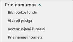 - Pasirinkę filtrą „Prieinamumas“, galėsite atitinkamai matyti tik tuos dokumentus, kurie yra pasiekiami internete arba yra laisvi bibliotekoje: