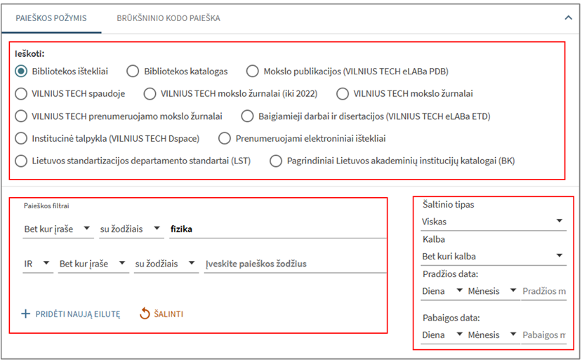 - Norint ieškoti ir fizinių ir elektroninių išteklių – rekomenduojama rinktis išteklių „Bibliotekos ištekliai“.