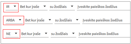 - Paieškos žodžius galima sieti loginiais operatoriais – IR, AR, NE: