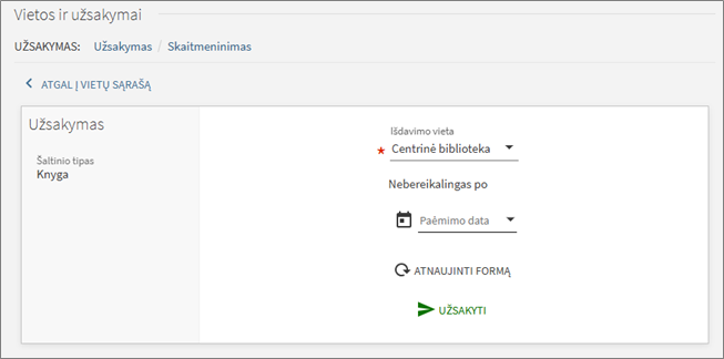- Vietos ir užsakymai – skirta bibliotekoje esantiems leidiniams užsakyti.