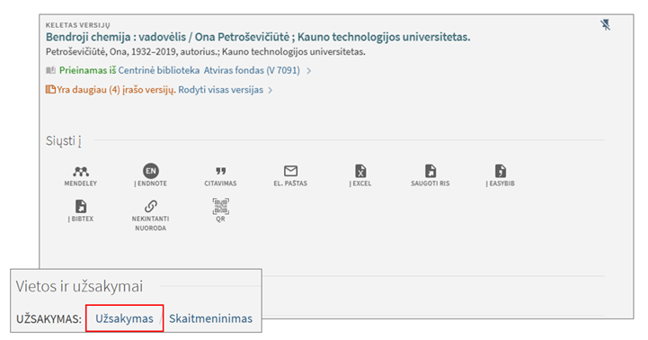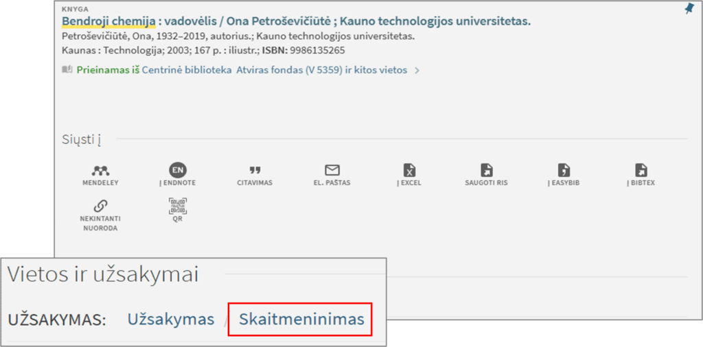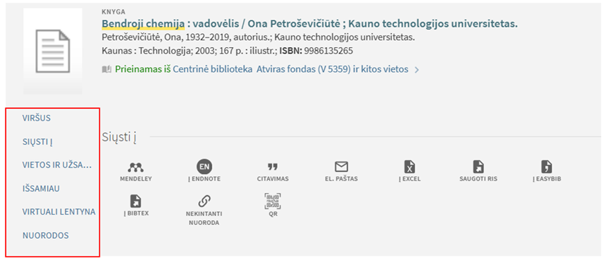 - Siųsti į – rasite nuorodas, kuriomis galėsite įrašą išsaugoti, išsisiųsti el. paštu ar nusiųsti į citavimo aprašų sudarymo programą, gauti nekintančią nuorodą ir pan.