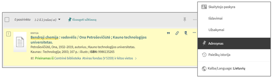 - Ieškant fizinių dokumentų – knygų ir leidinių, kuriuos galite užsakyti ir atsiimti Centrinėje bibliotekoje ar fakulteto skaitykloje – rekomenduojama rinktis išteklių „Bibliotekos katalogas“. Tuomet rezultatų bus mažiau ir bus paprasčiau susirasti norimą užsakyti knygą ar kitą leidinį.
