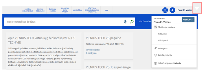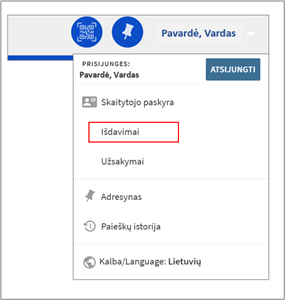 - Norint pratęsti pasiimtus leidinius, spustelėkite ant savo pavardės ir vardo, esančių viršutiniame kairiajame ekrano kampe
