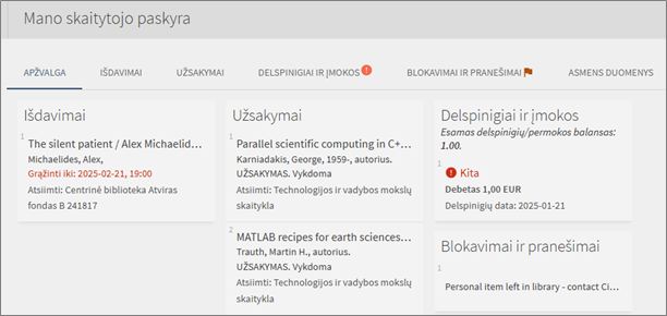 5. Blokavimai ir pranešimai – sustabdytas teises ar bibliotekos darbuotojų žinutes;