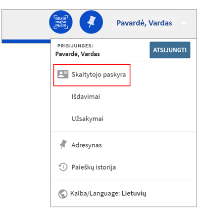 „Skaitytojo paskyra“ pasiekiama spragtelėjus pagrindinio sistemos meniu prisijungimo sritį viršutiniame dešiniajame kampe.