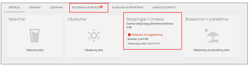 Čia galėsite matyti sukauptus delspinigius.