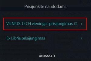 - Spustelkite „VILNIUS TECH vieningas prisijungimas“. Paspaudę įveskite savo prisijungimo duomenis (Vartotojo ID ir slaptažodį).