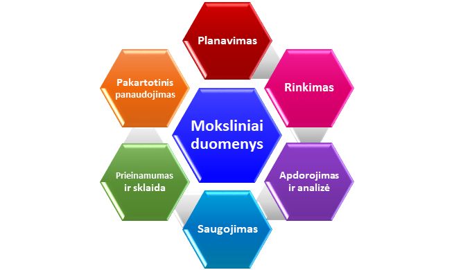 1 pav. Mokslinių duomenų valdymas (MDV) susideda iš keleto pagrindinių etapų, sudarančių ciklą.