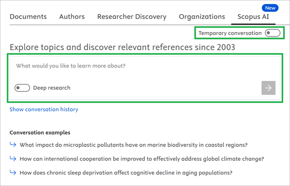 Pradiniame šio įrankio lange naudotojas gali pasirinkti, ar jo pokalbis su Scopus AI bus išsaugotas naudotojo pateiktų užklausų sąraše (Temporary conversation).