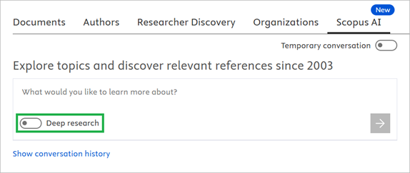 2025 m. Scopus AI buvo papildytas nauja Deep Research funkcija, kurią aktyvavus pradiniame įrankio lange ir pateikus užklausą sugeneruojama išsami apžvalga, kurią sudaro esminės informacijos apibendrinimas, rekomenduojamos tyrimų sritys ir metodai, aktualių publikacijų nuorodos bei kita informacija. Šias apžvalgas galima parsisiųsti PDF formatu.
