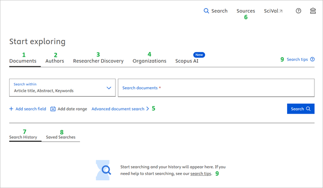 Scopus DB galima atlikti publikacijų [1] (Documents), autorių [2] (Authors), tyrėjų [3] (Researcher Discovery) ir institucijų [4] (Organizations) paiešką. Taip pat, galima atlikti išsamią paiešką [5] (Advanced document search) bei ieškoti arba naršyti visuose indeksuojamuose periodiniuose leidiniuose [6] (Sources).