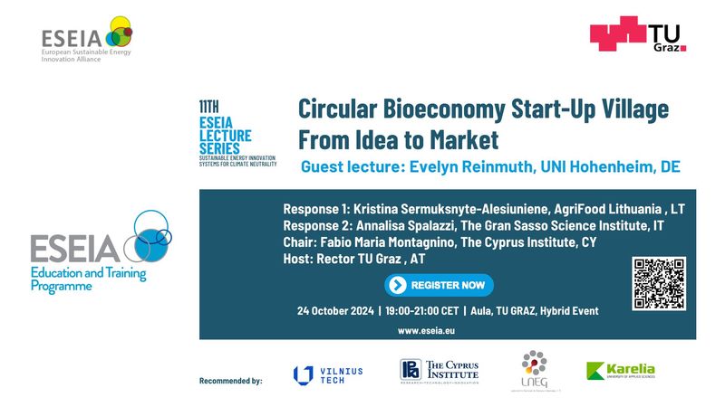 The eleventh lecture, on Circular Bioeconomy Start-Uo Villages: From Idea to Market will be held at Aula, TU Graz, 24 October 2024, 19:00 – 21:00 CET. The lecture is also accessible online.