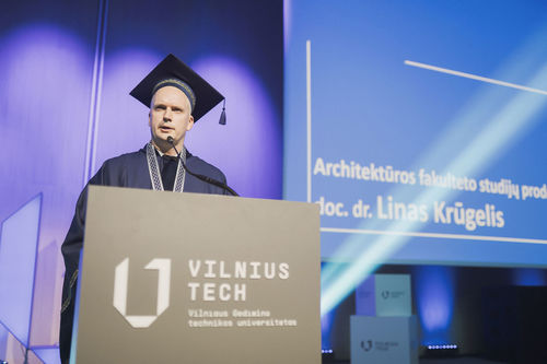 Architektūros fakulteto (AF) Dizaino katedros docentas dr. Linas Krūgelis savo kalboje pabrėžė, kad diplomo gavimas – tai ne pabaiga, o naujo, laisvo ir kūrybiško etapo pradžia.
