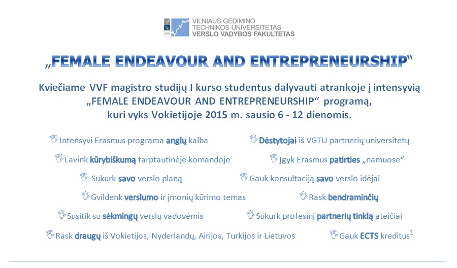 Kviečiame VVF magistro studijų I kurso studentus dalyvauti atrankoje į intensyvią „FEMALE ENDEAVOUR AND ENTREPRENEURSHIP“ programą