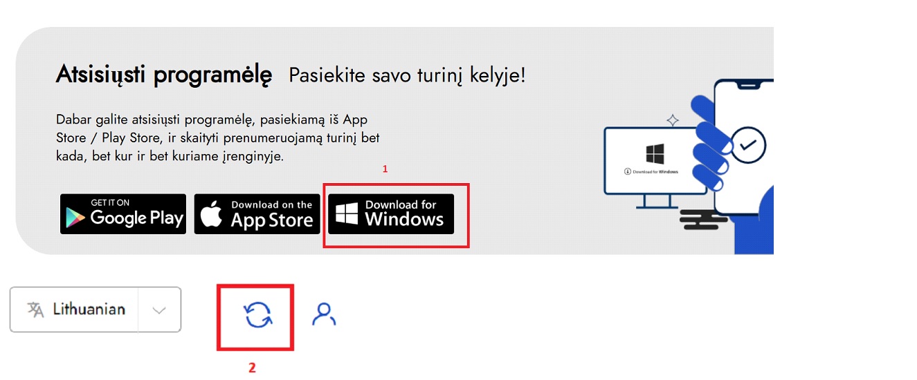 - Įdiegti naujausią „Monk Windows Desktop App“ versiją (1), o po įdiegimo prisijungti prie savo asmeninės paskyros ir atlikti sinchronizaciją, kad el. knygos būtų pasiekiamos skaitymui neprisijungus (2).