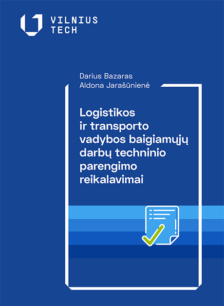 Darius Bazaras, Aldona Jarašūnienė Logistikos ir transporto vadybos baigiamųjų darbų techninio parengimo reikalavimai Metodiniuose nurodymuose apžvelgiama, ką turėtų žinoti studentas, įformindamas baigiamąjį darbą. Baigiamasis darbas – tai parengtas didelės apimties dokumentas. Todėl svarbu tinkamai jį įforminti. Labai svarbu tinkamai įforminti turinį, automatiškai suformuoti paveikslų ir lentelių sąrašus. Labai palengvina darbą vienodai tvarkomas literatūros šaltinių sąrašas. Metodiniai nurodymai skiriami logistikos ir transporto vadybos studijų programų studentams. Elektroninė knyga >>> * VILNIUS TECH instituciniai vartotojai el. knygas gali skaityti nemokamai prisijungę universiteto kompiuterių tinkle, o iš namų prisijungę prie universiteto tinklo per VPN. Norint skaityti el. knygas be interneto, reikia įsidiegti IPC Reader offline programėlę ir, būnant prisijungus prie institucinio tinklo, atsisiųsti į skaityklę pageidaujamas knygas. Vėliau jas galėsite skaityti atsijungę nuo interneto. Daugiau VILNIUS TECH išleistų el. knygų rasite ebooks.vilniustech.lt |