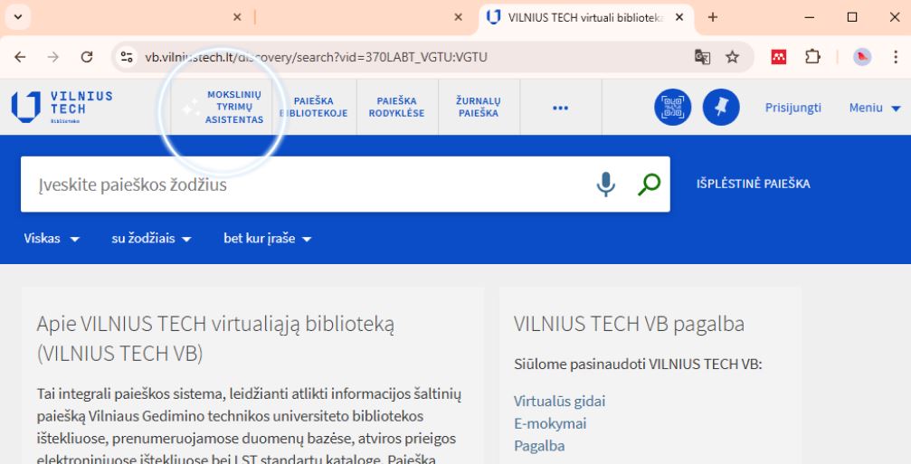 „Mokslinių tyrimų asistentas“ – inovatyvus įrankis, paremtas generatyviniu dirbtiniu intelektu ir didelės apimties kalbos modeliais (LLM). Šiuo įrankiu galima naudotis prisijungus per VILNIUS TECH Virtualiąją biblioteką su instituciniu ID ir slaptažodžiu, kas užtikrina saugią ir patikimą prieigą prie akademinių išteklių.