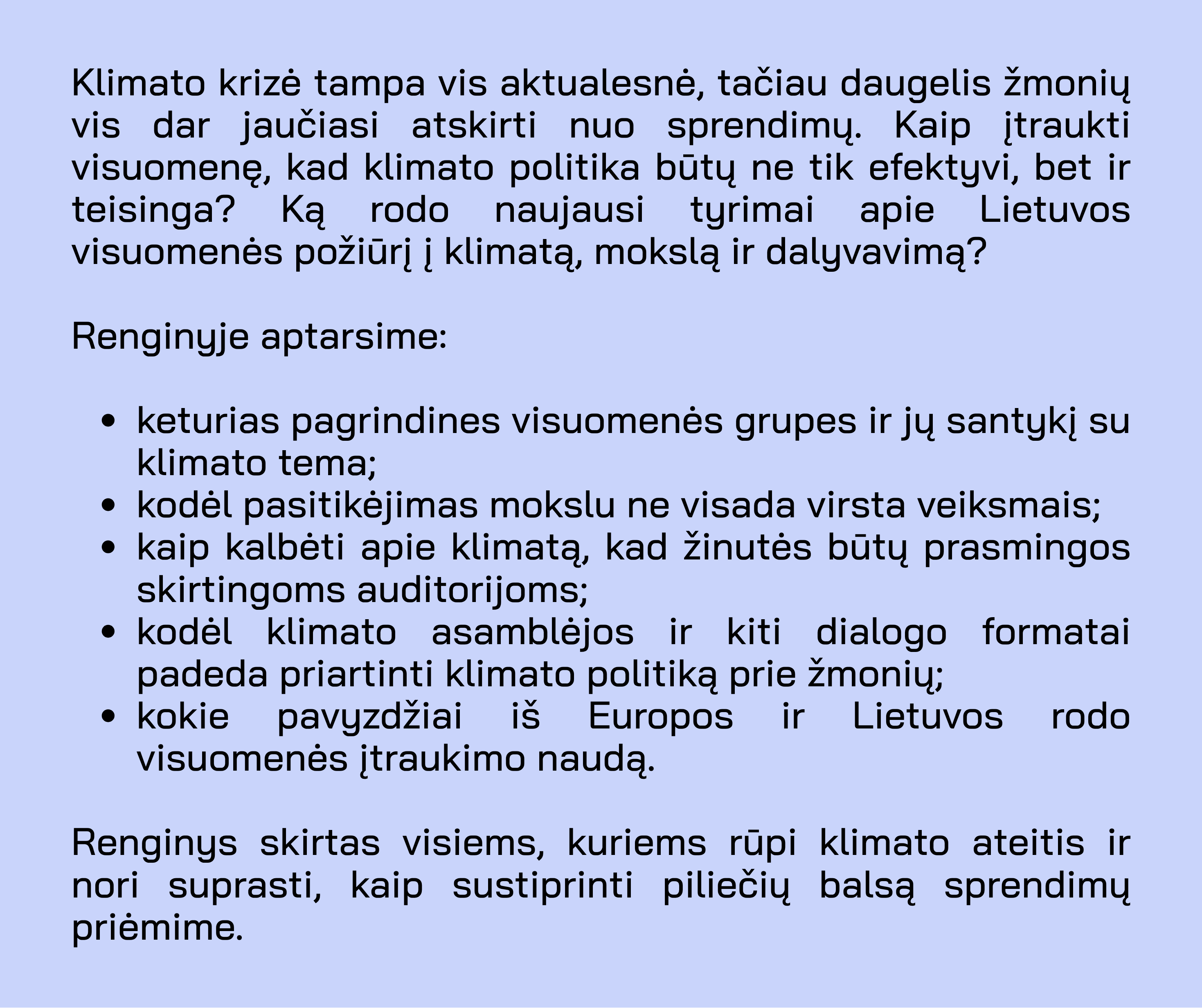 Renginys organizuojamas septintosios Klimato savaitės, kurią inicijuoja Aplinkos ministerija, metu, ypatingą dėmesį skiriant Paryžiaus susitarimo priėmimo 10 metų sukakčiai – dokumento, kuriuo pasaulio šalys įsipareigojo bendromis jėgomis riboti klimato kaitą.