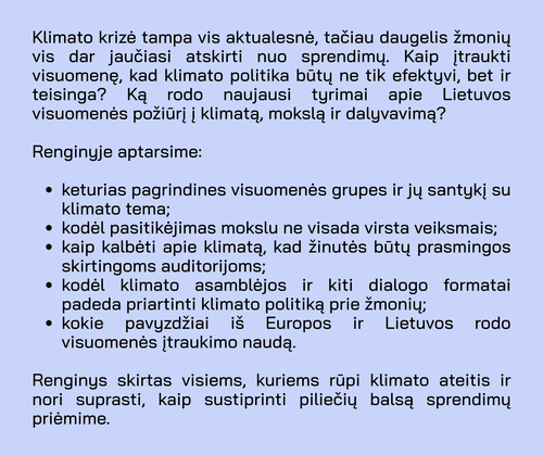 VILNIUS TECH piliečių mokslo centras, bendradarbiaudamas su tarptautiniais partneriais organizuoja diskusiją, skirtą tiems, kam rūpi klimato ateitis ir nori suprasti, kaip sustiprinti piliečių balsą sprendimų priėmime.