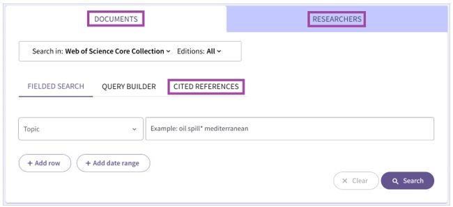 The Basic Search allows users to search for publications (Documents), Cited References, and Authors (Researchers):