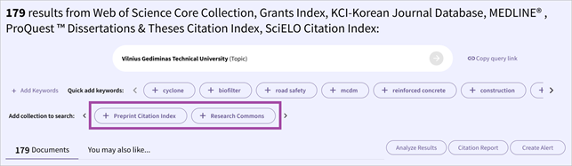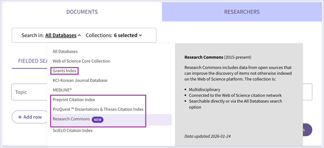 In 2023–2025, WoS DB was expanded by adding additional resources of specific documents (Preprint Citation Index and ProQuest™ Dissertations & Theses Citation Index), grants (Grants Index) and Research Commons collection, which includes journal output from open metadata platforms such as Crossref and OpenAlex.