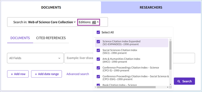 Upon selection to search within only WoS Core Collection part, the search context can be further specified by selecting only particular indexes (Editions):