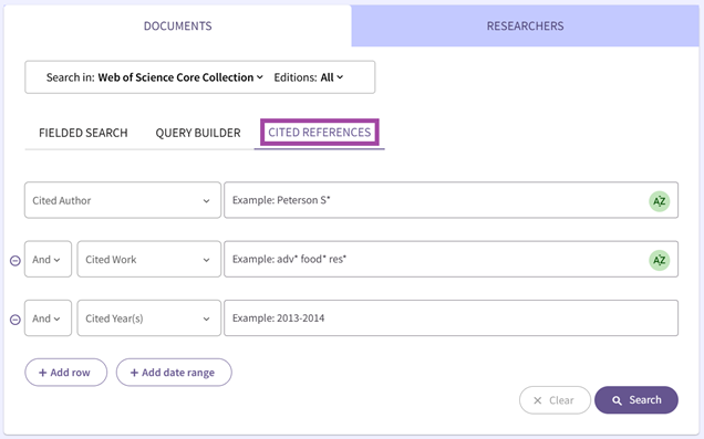 Document (and cited reference) search can be performed only within the WoS Core Collection part, in the content of all available DB sections, or in individual regional or specific document DBs (in these cases, the search and filtering options may be narrower than searching within WoS Core Collection content).
