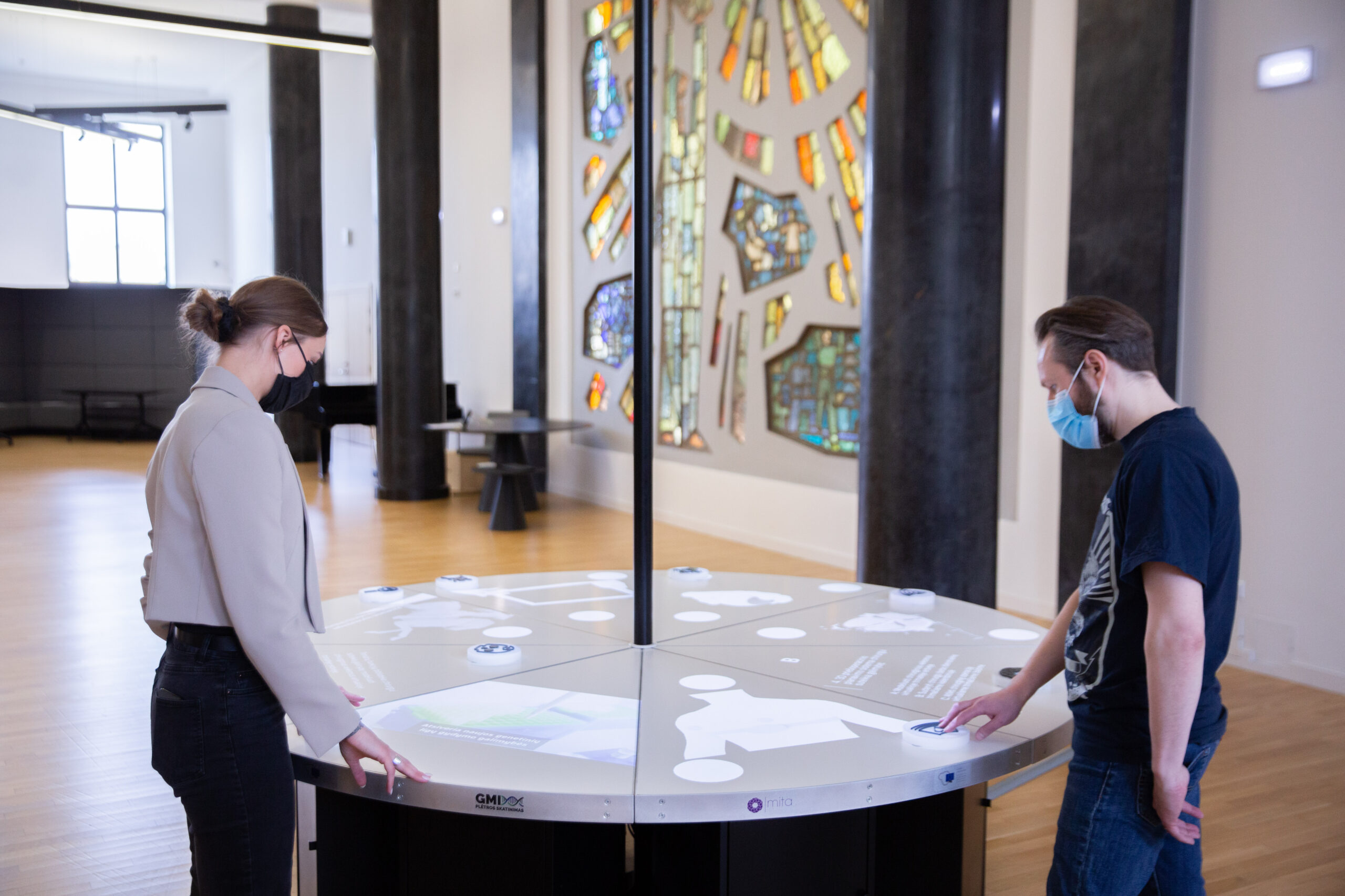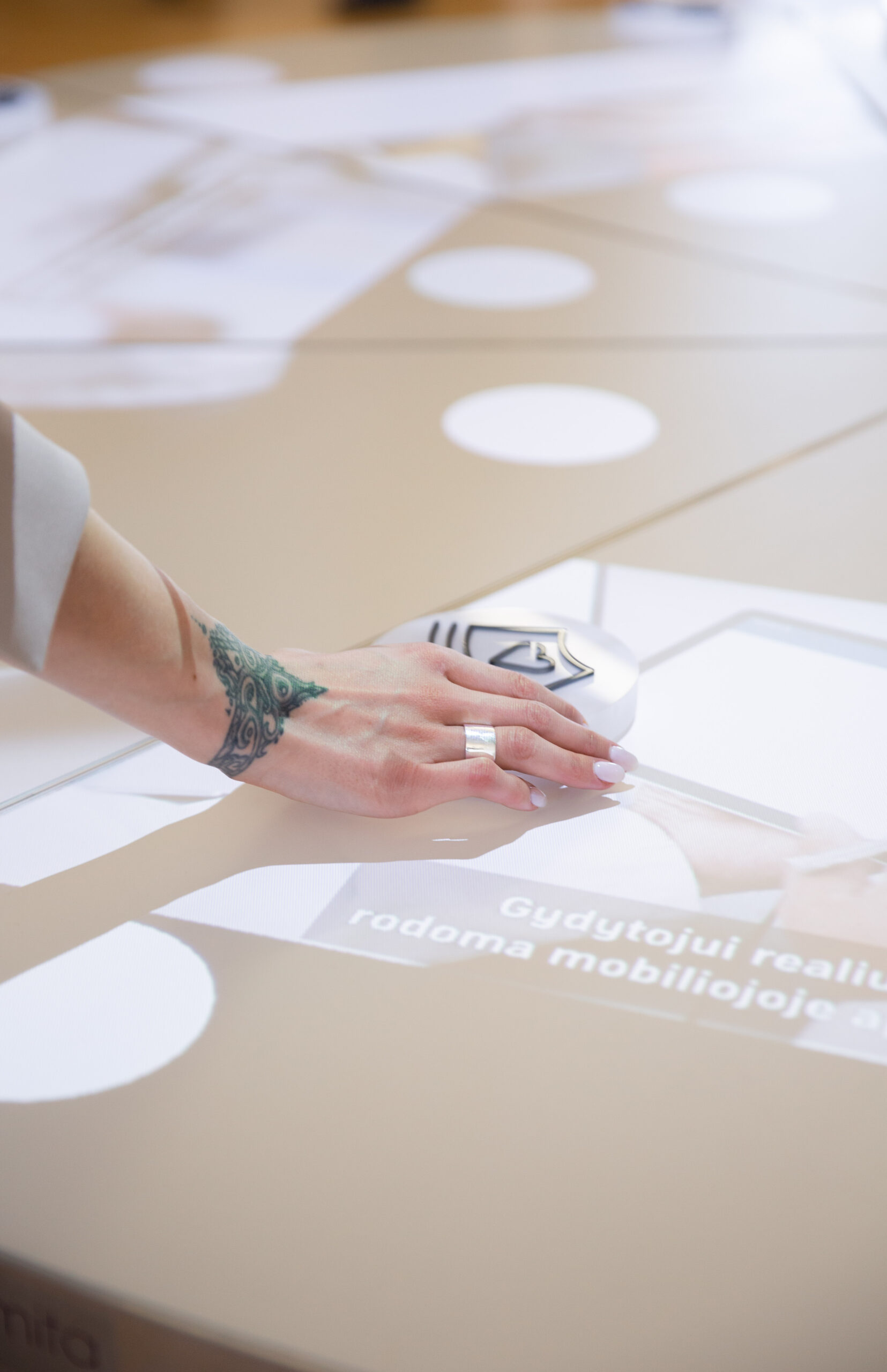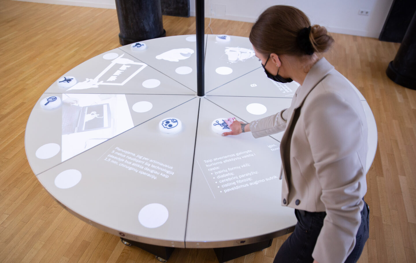 „Stende pateikta informacija leidžia interaktyviai susipažinti su Lietuvos gyvybės mokslų inovacijomis. Jame galima pamatyti kiekvienos inovacijos trimatį modelį, peržiūrėti apie inovaciją pasakojantį vaizdo įrašą ir perskaityti trumpą aprašymą. Šis skaitmeninis grafinis turinys pateikiamas projektuojant vaizdą apskrito stendo paviršiuje pasitelkiant papildytos realybės sprendimą ir naudojant projektorius. Stende įrengtos kameros fiksuoja stendo detalių pozicijas pasitelkiant vaizdų atpažinimo algoritmą,“ – pasakoja prie stendo kūrimo proceso prisidėjęs VILNIUS TECH „LinkMenų fabriko“ virtualios realybės specialistas ir projektų vadovas.