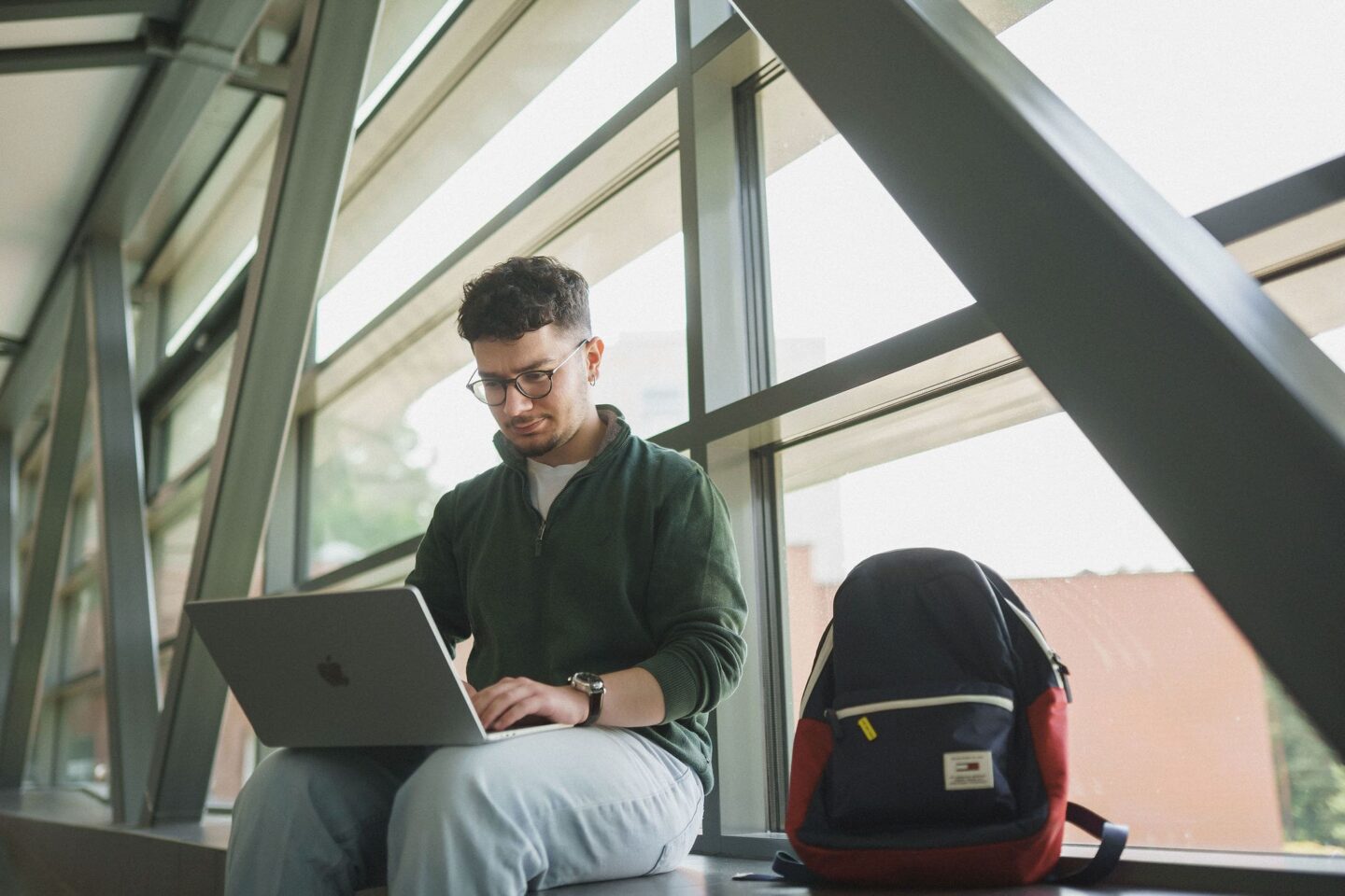 Studentas dirba kompiuteriu tuščioje auditorijoje