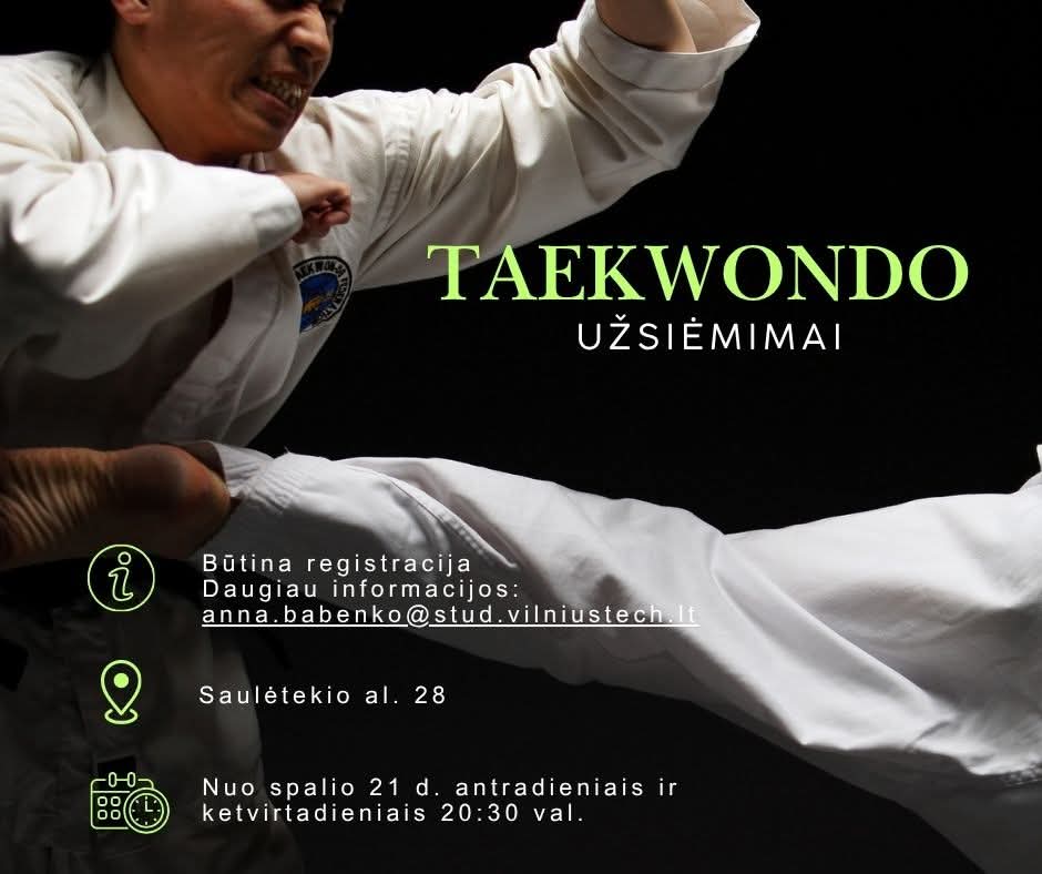 Taekwondo – tai korėjietiškas kovos menas ir olimpinis sportas, kuriame derinamas jėgos, lankstumo ir disciplinos ugdymas. Treniruotės lavina ištvermę, greitį, koordinaciją bei moko susikaupimo ir pasitikėjimo savimi. Prisijunk prie tekvondo treniruočių Vilnius Tech ir atrask sportą, kuris stiprina tiek kūną, tiek charakterį.