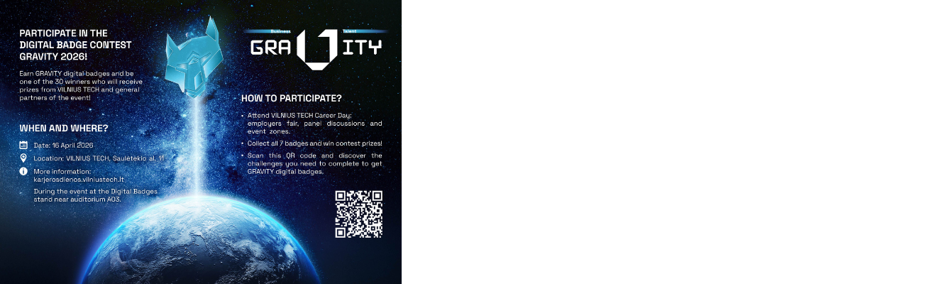 Daugiau informacijoskarjerosdienos.vilniustech.lt, renginio dieną – skaitmeninių ženkliukų stende prie A03 auditorijos.