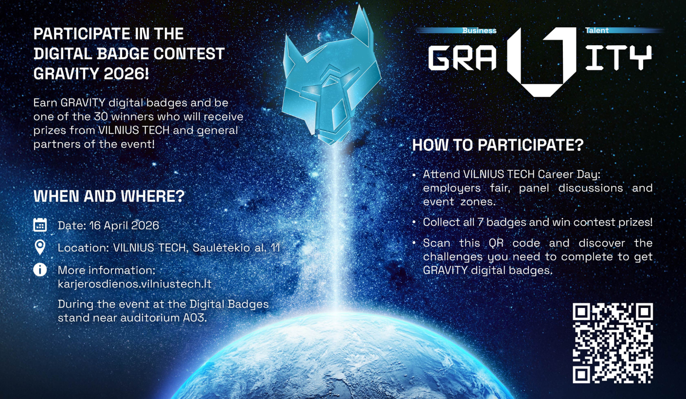 Šią dieną vyks skaitmeninių ženkliukų konkursas, kurio tikslas – skatinti studentų aktyvų dalyvavimą renginio veiklose. Surinkus visus 7 GRAVITY skaitmeninius ženkliukus, atsiveria galimybė dalyvauti GRAVITY ženkliukų konkurse ir laimėti vieną iš 30 VILNIUS TECH ir  renginio generalinių partnerių įsteigtų prizų.