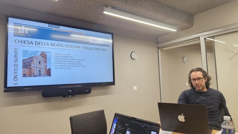 Pirmąją susitikimo dieną didelis dėmesys skirtas technologiniams sprendimams, susijusiems su BIM (Building Information Modeling) metodais ir jų taikymu reprezentuojant pastatų defektus virtualiuose modeliuose. Taip pat buvo aptarti dirbtinio intelekto sprendimai, naudojami atliekant 3D skaitmeninius tyrimus bei analizuojant pažeistų pastatų būklę.