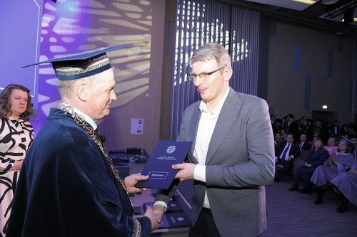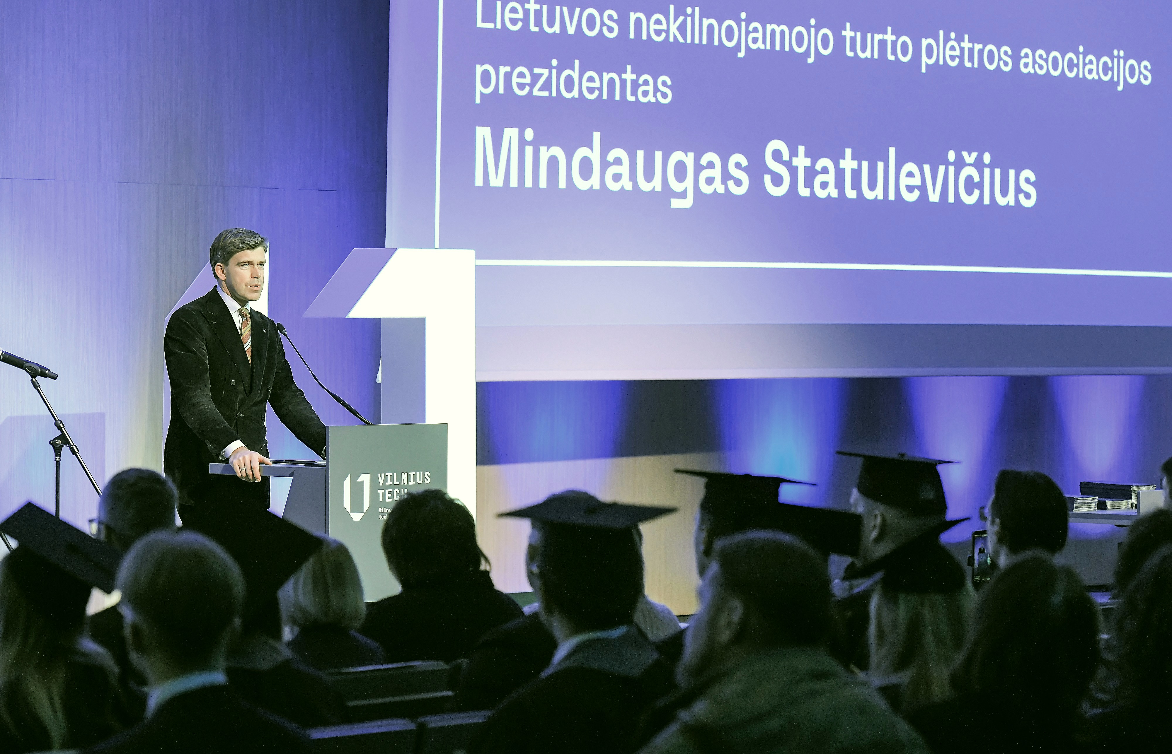 Lietuvos nekilnojamojo turto plėtotojų asociacijos (LNTPA) prezidentas ir VILNIUS TECH alumnas Mindaugas Stasiulevičius savo įkvepiančioje sveikinimo kalboje linkėjo kurti ateities miestus ir Lietuvą: