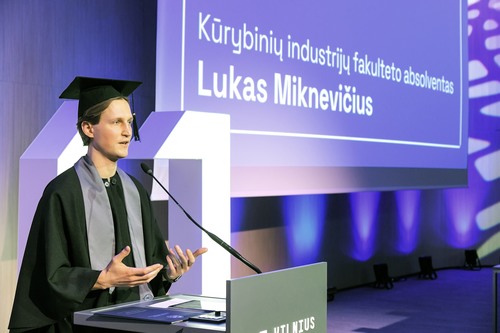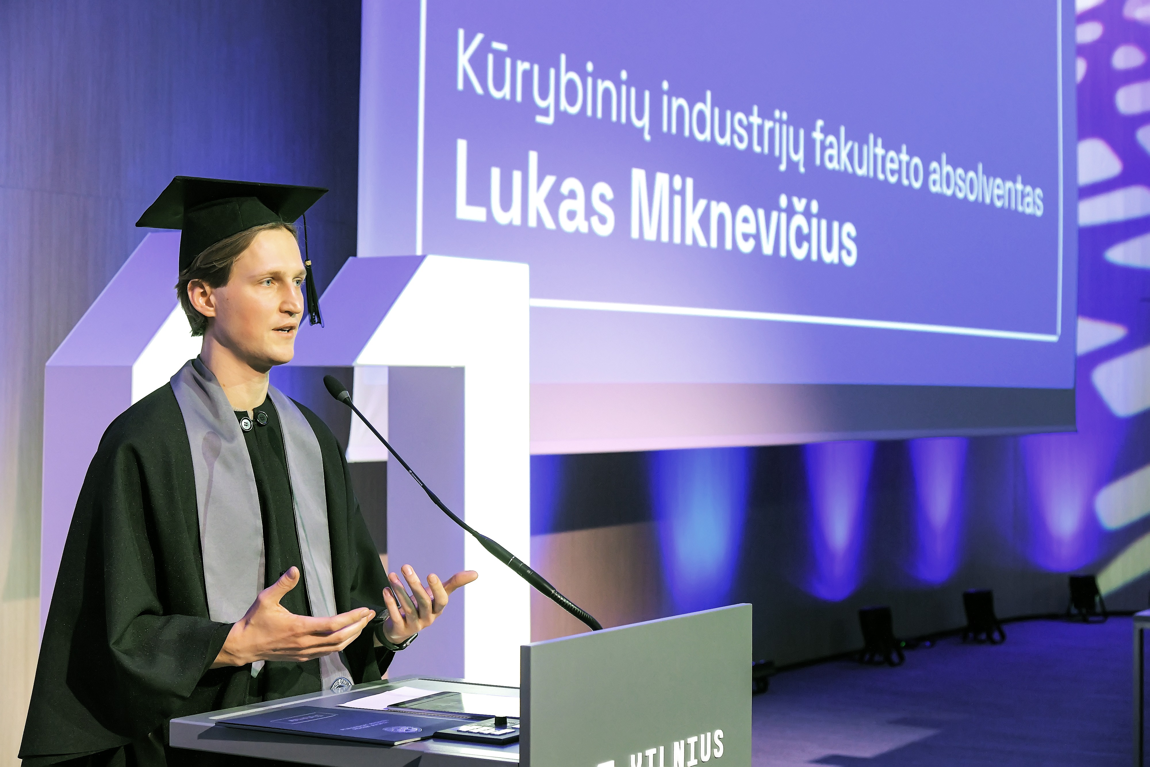 Su pagyrimu studijas baigęs Kūrybinių industrijų absolventas Lukas Miknevičius kvietė savo kartos atstovus būti ne tik skaitmeniniais, bet ir drąsiais piliečiais, nebijančiais išreikšti savo nuomonės ir kovoti už tiesą.