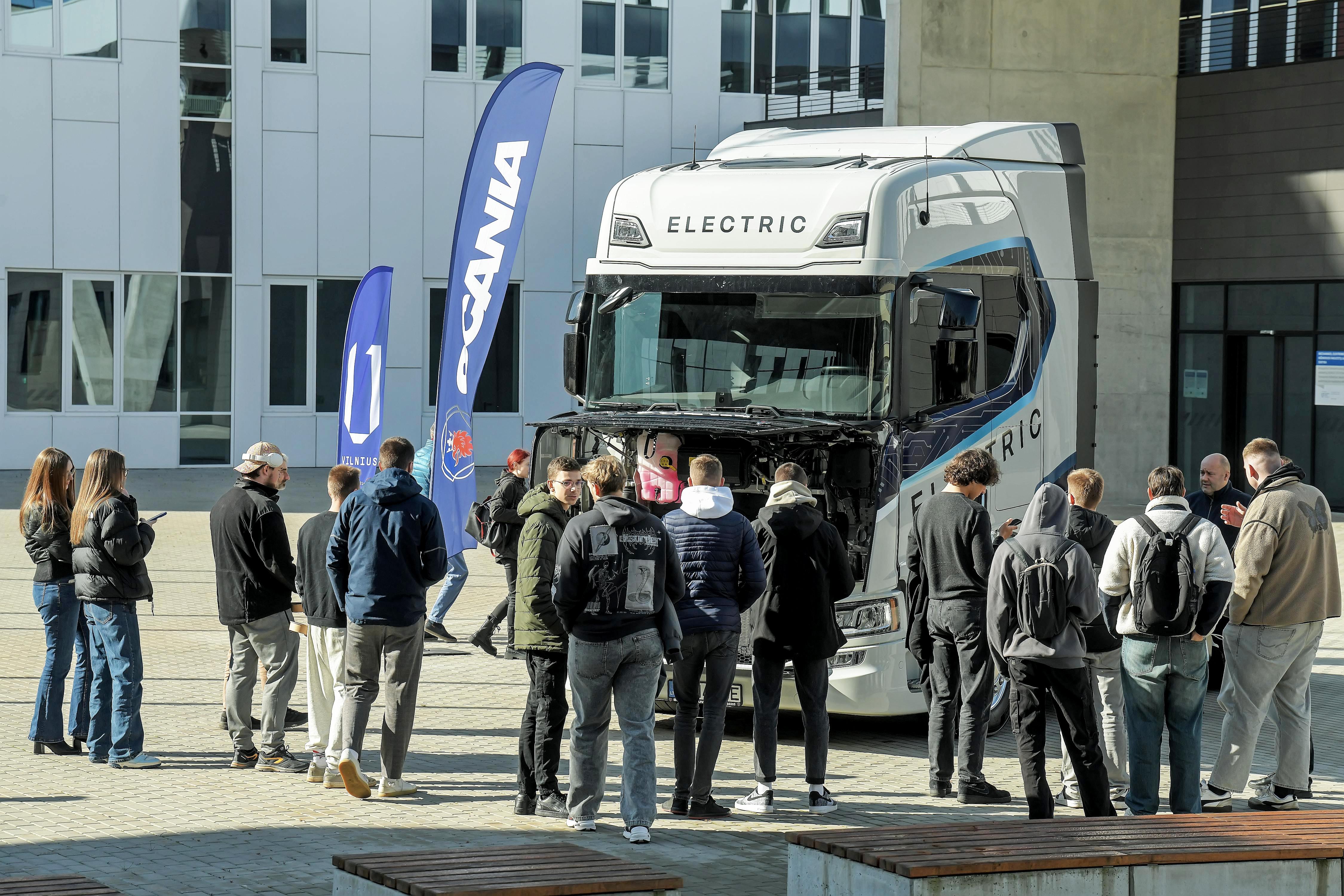 VILNIUS TECH Transporto inžinerijos fakultete (TIF) įvyko „Scania BEV Road Show 2025“ – renginys, subūręs akademinės bendruomenės ir transporto sektoriaus atstovus pažvelgti į elektrinio sunkiojo transporto ateitį.