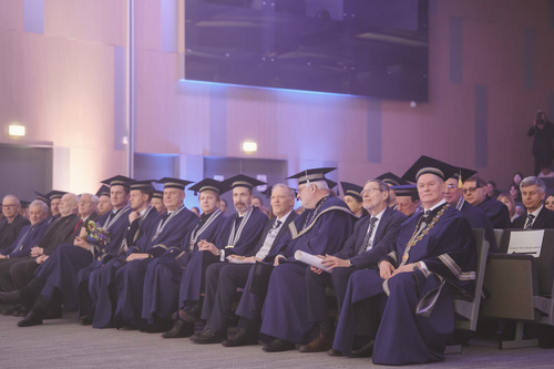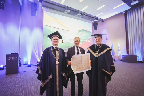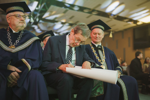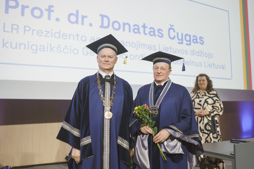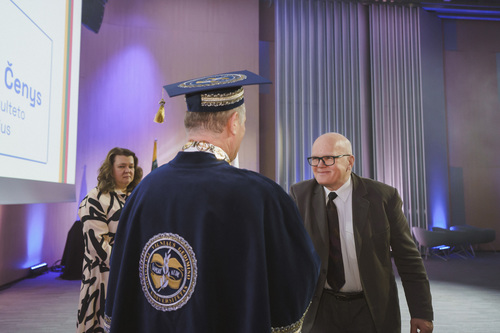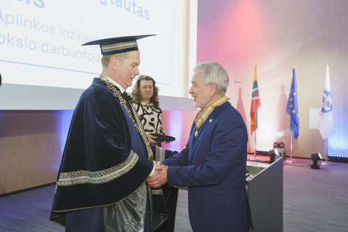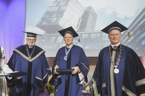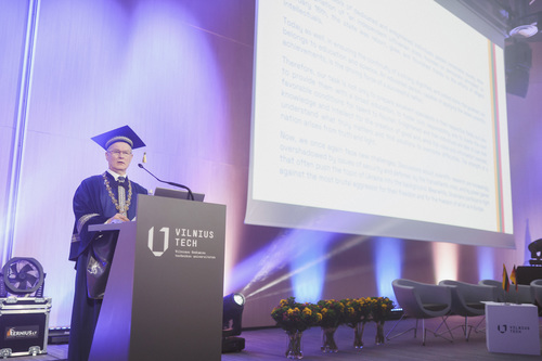 Ceremonijos metu VILNIUS TECH suteikė Garbės daktaro vardą Brandenburgo technologijos universiteto (BTU, Vokietija) profesoriui habil. dr. Hartmutui Pasternakui – iškiliam plieninių ir kompozitinių konstrukcijų srities mokslininkui, ilgamečiam akademinės bendruomenės lyderiui ir aktyviam VILNIUS TECH partneriui.