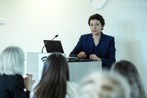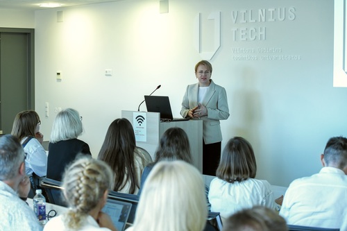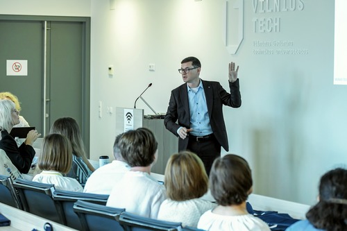 VILNIUS TECH Mokslo direkcijos vadovas doc. dr. Vaidotas Vaišis pristatė universiteto tyrimų kūrimo strategiją bei jos įgyvendinimą, kompetencijų centrus. Kalbant šia tema, svečius domino tyrimų prioritetų nustatymas bei mokslui skirta infrastruktūra.